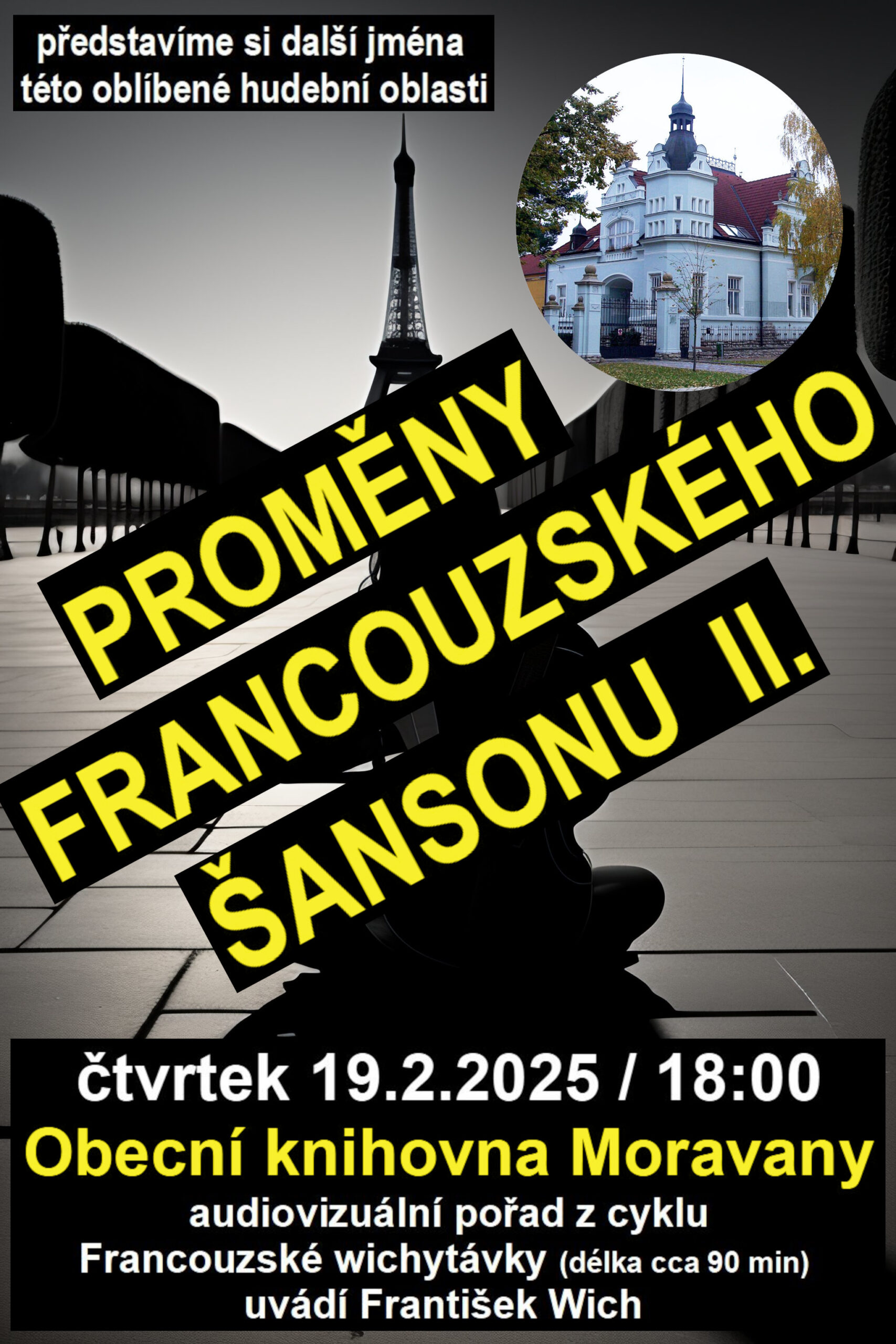 V knihovně v Moravanech se dne 19.2.2026 od 18,00 hod koná audiovizuální pořad z cyklu Francouzské wichytávky – proměny francouzského šansonu. Uvádí František Wich
