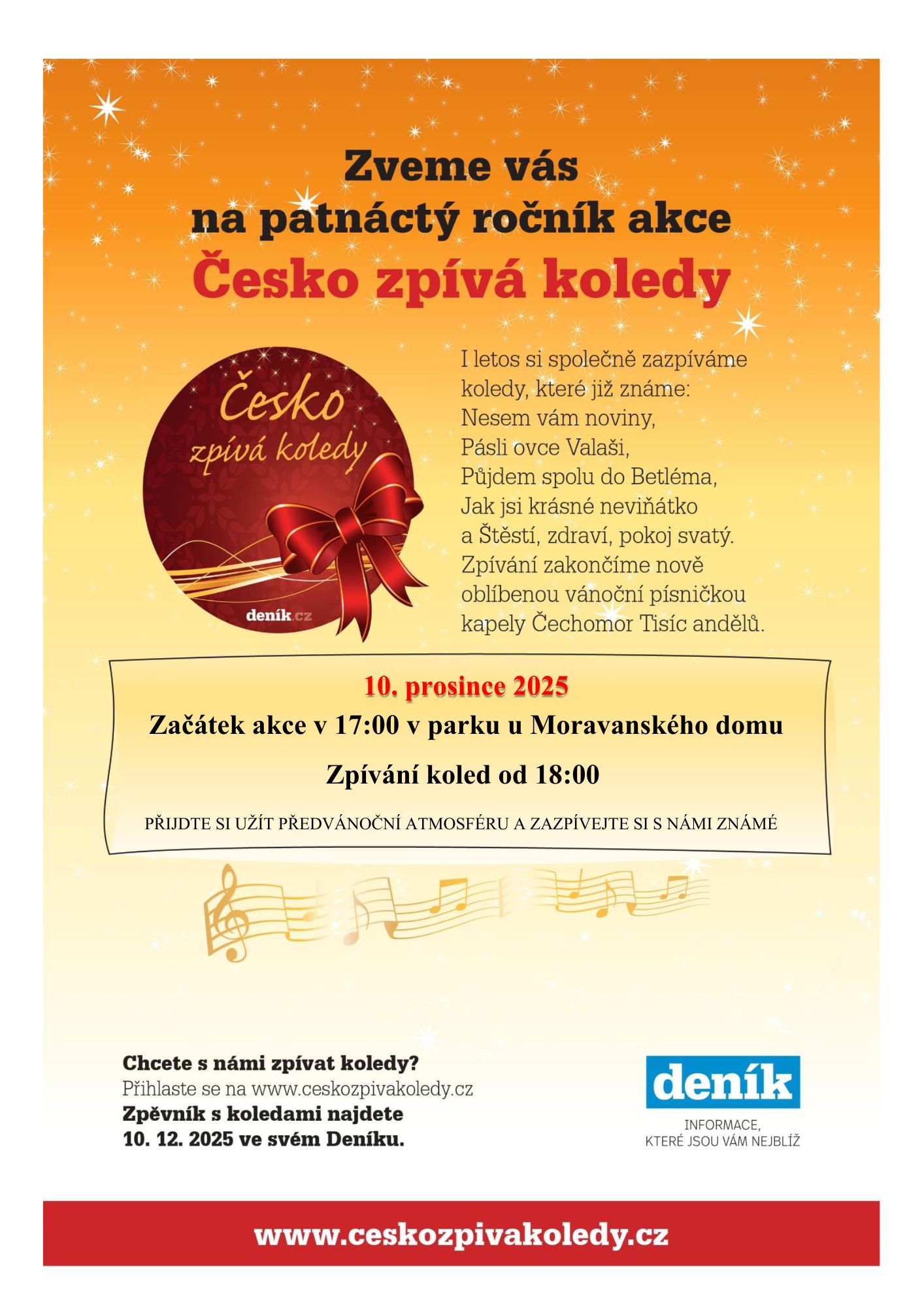 Zveme Vás na 15. ročník akce "Česko zpívá koledy", která se koná 10. prosince 2025 od 17,00 hod. v parku u Moravanského domu. Samotné zpívání koled začne v 18,00 hod.