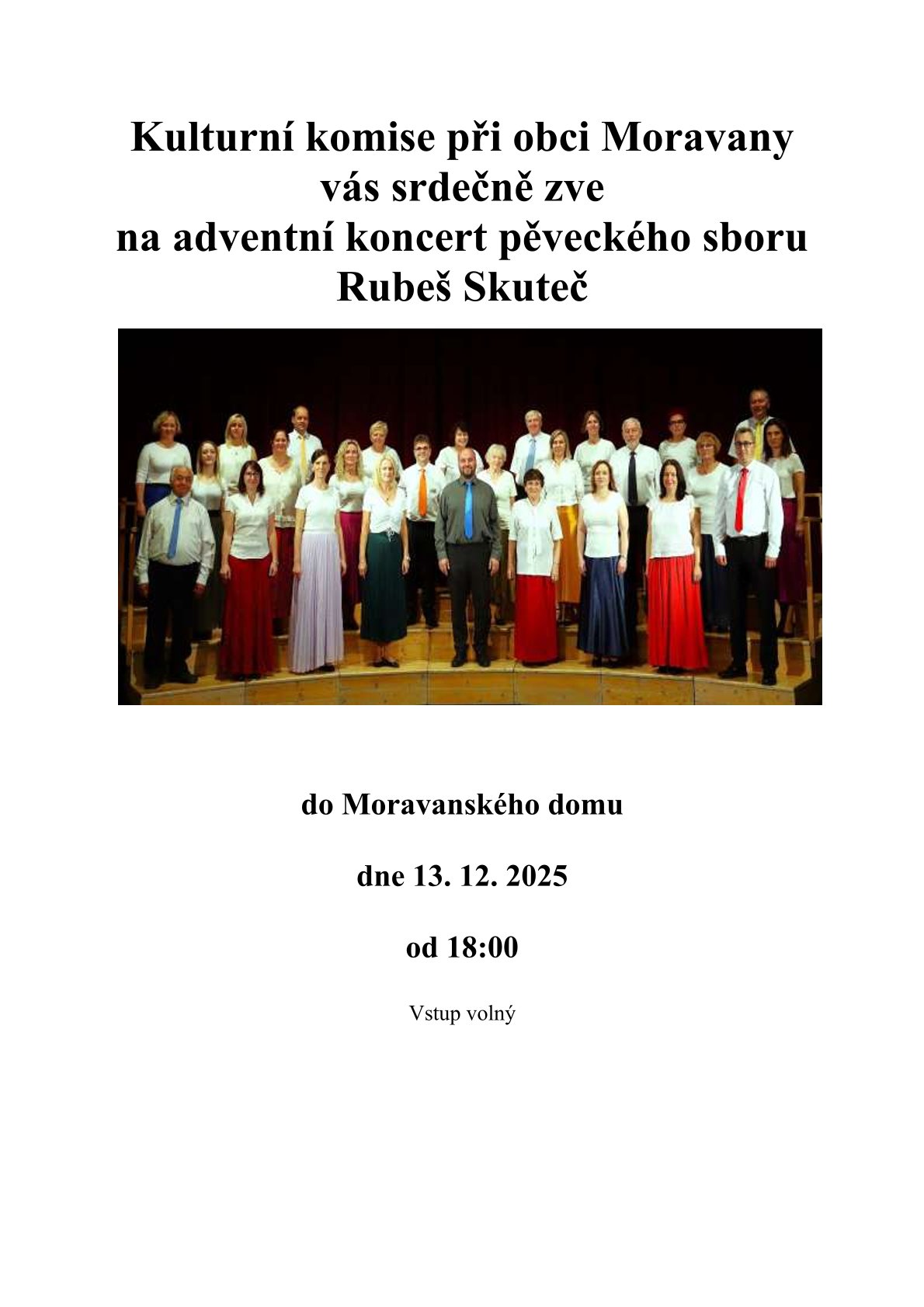 Kulturní komise při obci Moravany zve na adventní koncert pěveckého sboru Rubeš Skuteč, který se koná 13. 12. 2025 od 18,00 hod. v Moravanském domě. Vstup volný.