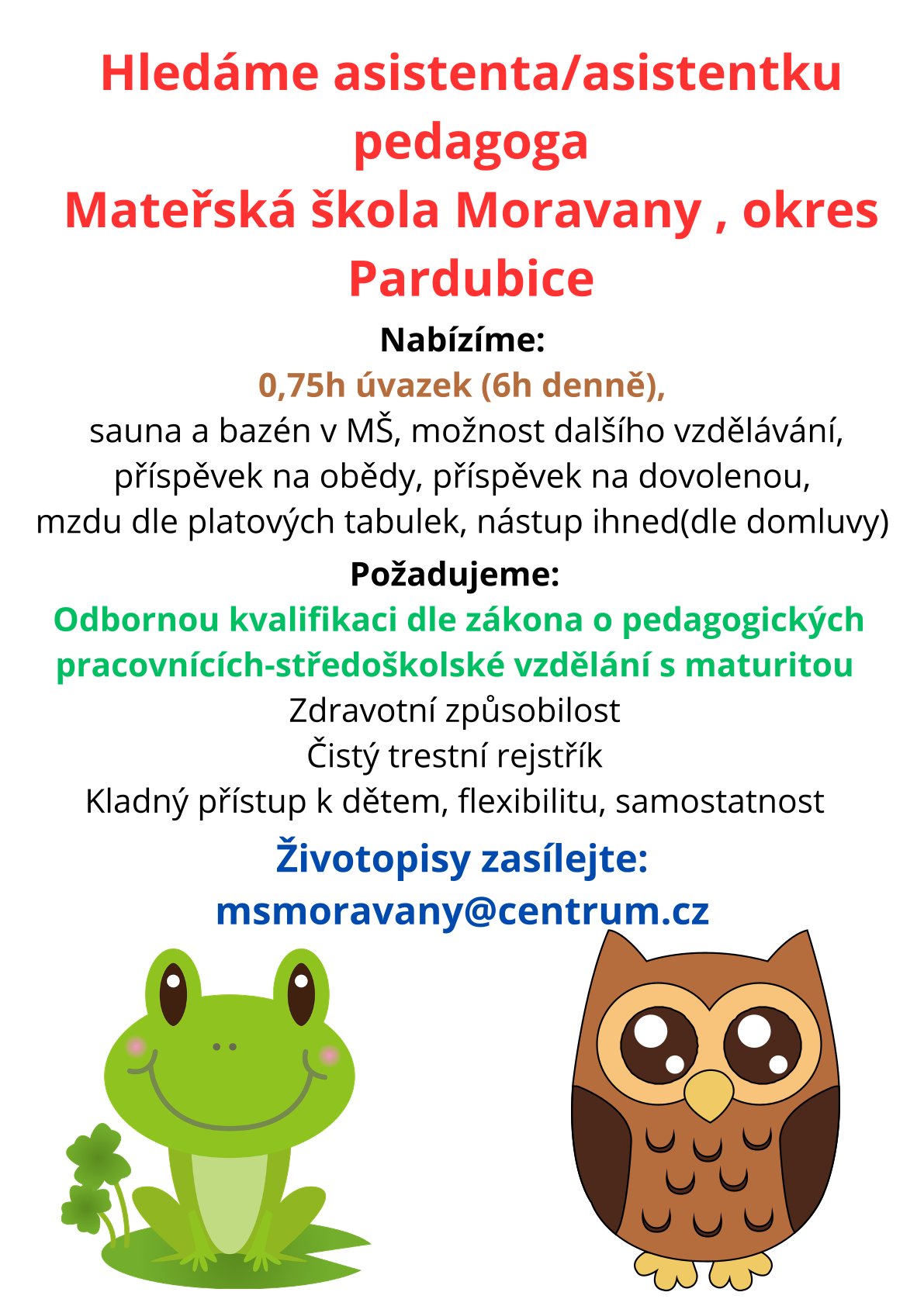 Nabídka volného pracovního místa v Mateřské škole Moravany
