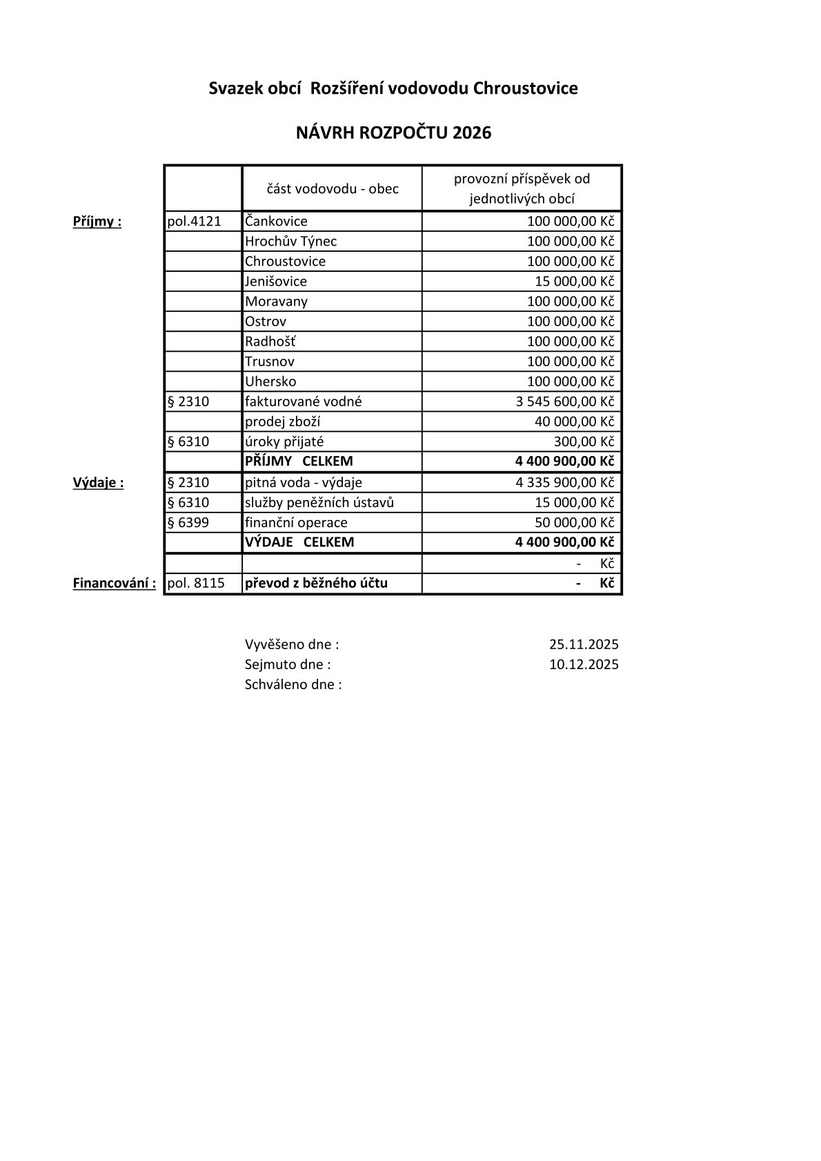 Návrh rozpočtu Svazku obcí Rozšíření vodovodu Chroustovice na rok 2026