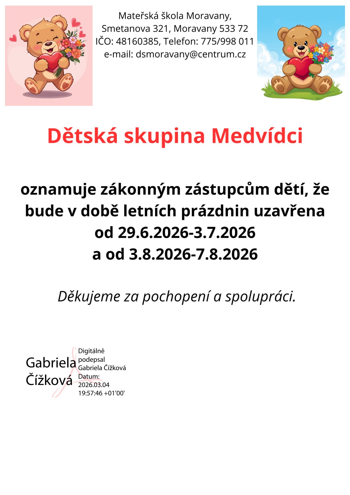 Uzavření dětské skupiny Medvídci v MŠ Moravany v době letních prázdnin